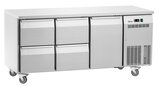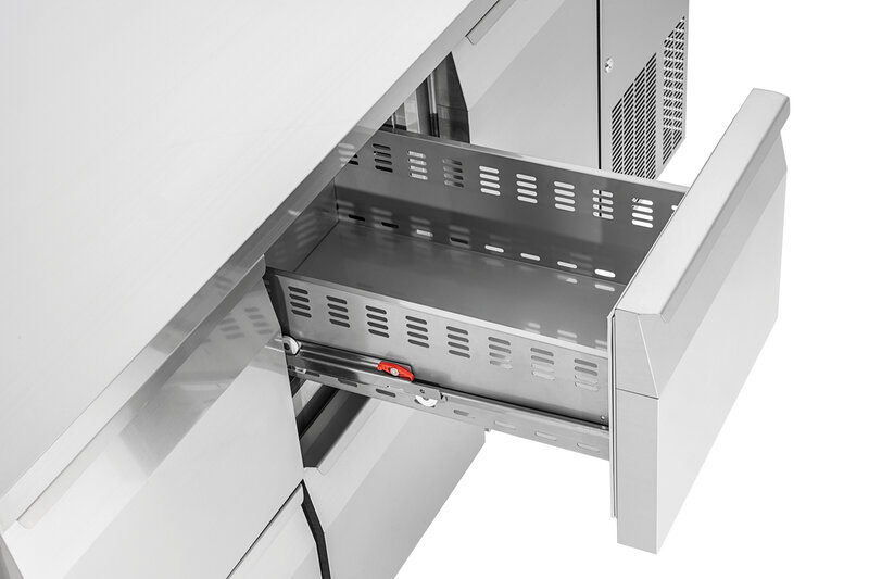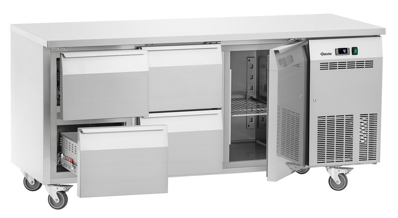 De koeltoonbank met 1 deur en 4 lades zorgt voor een gelijkmatige en constante koeltemperatuur in het hele interieur dankzij het convectiekoelsysteem. Het robuuste roestvrijstalen oppervlak past naadloos in elke keuken en kan ook worden gebruikt als praktisch werkblad. Dankzij Klimaatklasse 5 is deze koelkast ook geschikt voor bijzonder warme omgevingen.