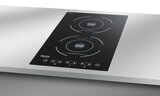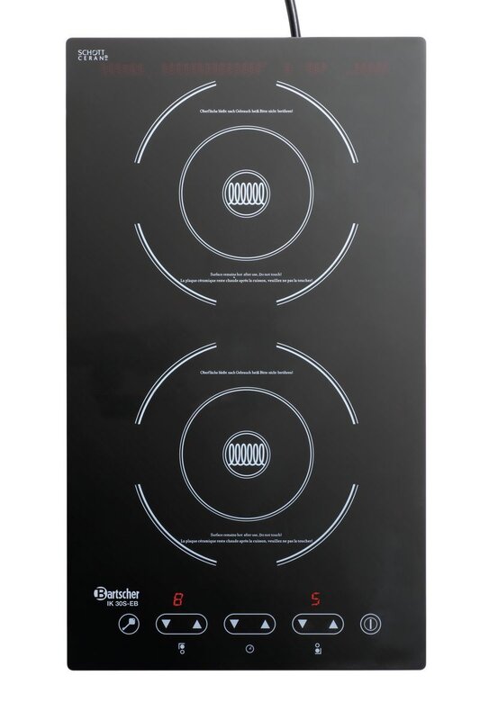 Integreerbare, ruimtebesparende inductiekookplaat met achter elkaar liggende kookzones en een doorlopend keramisch Schott-ceraan-oppervlak.