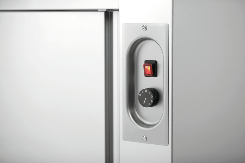 De warmkast met een breedte van 1,4 meter biedt een traploos instelbare, verwarmde opbergruimte met bediening aan beide kanten. Het robuuste oppervlak van roestvrij staal vormt tegelijkertijd een solide werkelement in de keuken.