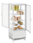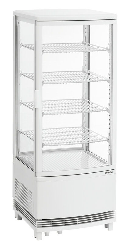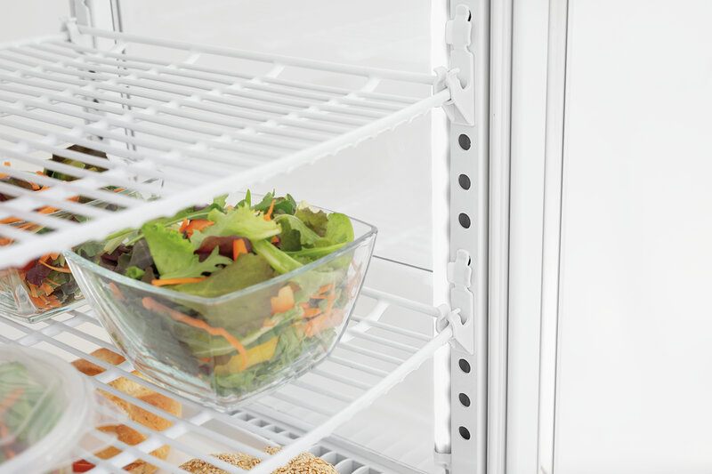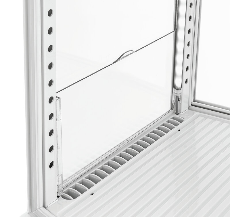 De mini-koelvitrine met gewelfde vleugeldeuren aan voor- en achterkant is ideaal voor het baliebereik. Door in hoogte verstelbare roosters biedt de witte koelvitrine een flexibele vulling op 4 niveaus bij een inhoud van 98 liter. Met de LED-verlichting wordt gekoeld voedsel optimaal gepresenteerd en in het beste licht gezet.
