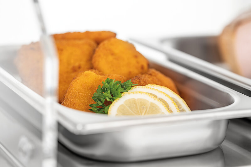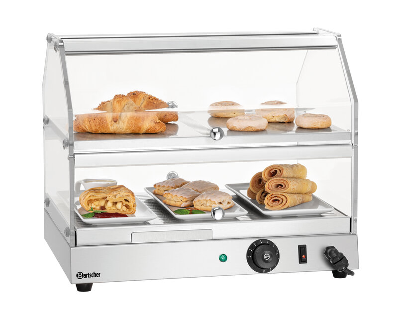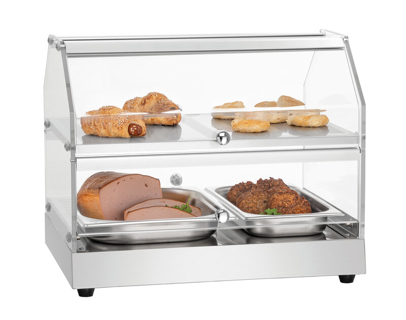 Verwarmende vitrine met twee niveaus voor perfect gepresenteerde culinaire hoogstandjes. Dankzij de warme, vochtige lucht is het voedsel zelfs na enkele uren bewaren nog warm en sappig - net als vers uit de oven. Twee scharnierende deuren aan de voor- en achterkant maken het gemakkelijk om de tas aan beide kanten uit te nemen en te bezetten.