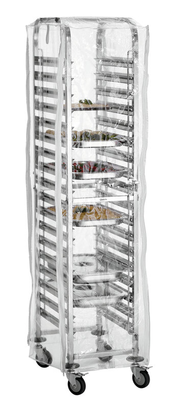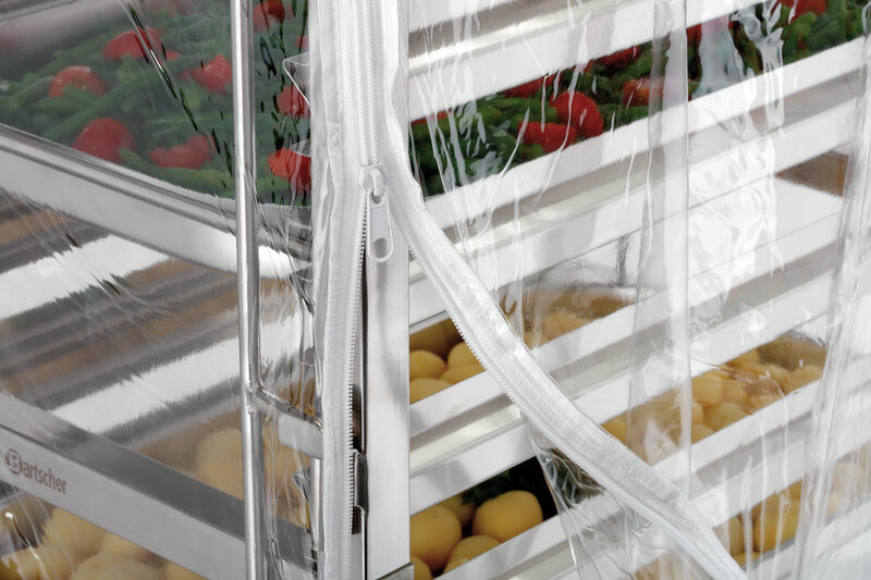 De bij de gastronomiewagen AGN1800-1/1 passende transparante afdekhoes beschermt bij transport en opslag tegen stof en onzuiverheden - zelfs in koelruimten. De ritssluitingen maken een ongecompliceerd vullen van de wagen mogelijk, ook met opgetrokken hoes.