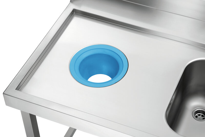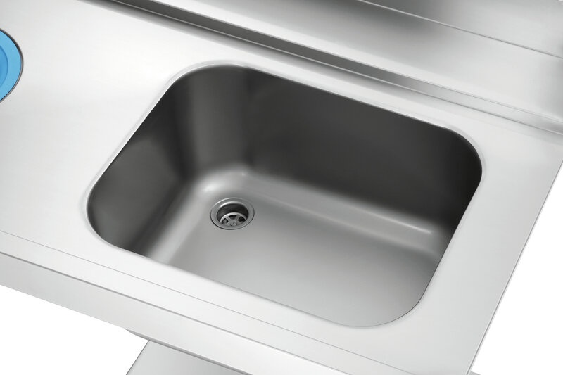 De 1,2 m brede voorreiniging met spoelbak en afvalschacht is ontworpen voor aanbouw aan de linkerkant van de Bartscher doorschuifvaatwasmachines DS. Een basisbodem biedt opbergruimte voor spoelkorven.