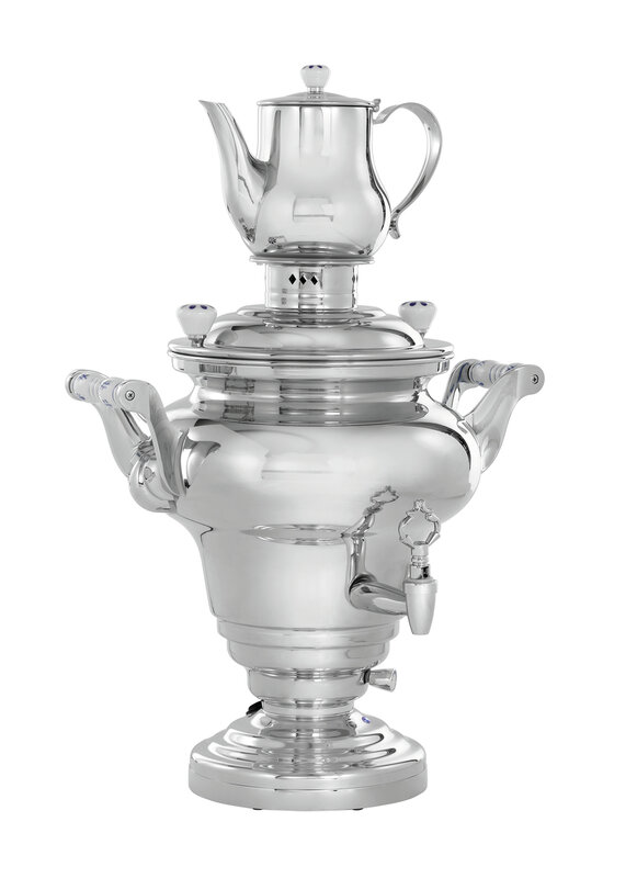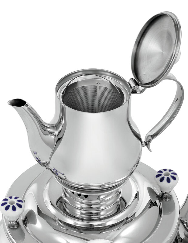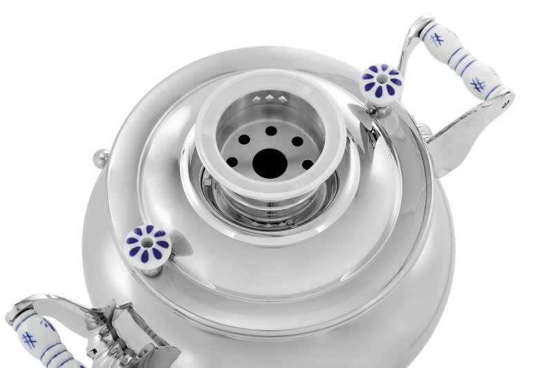 De Samowar blinkt in het bijzonder uit door zijn grote capaciteit van 15 liter, de hoge energie-efficiëntie en het klassieke design met versierde keramische grepen. Tot 2 liter kan in de theepot met theezeef worden gegoten.