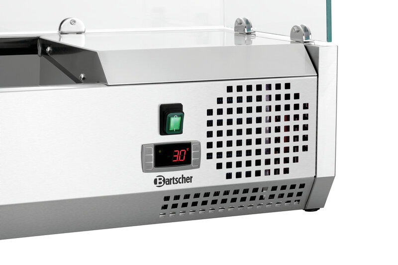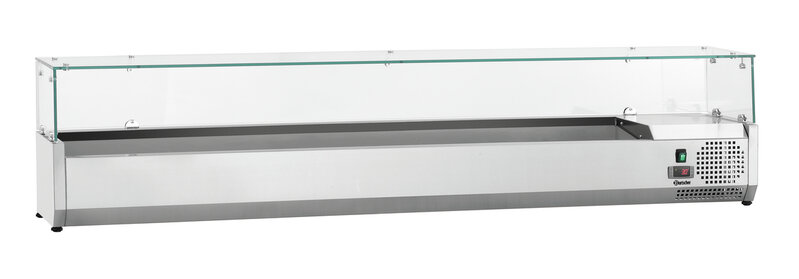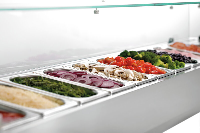 Met ruimte voor maximaal 10x 1/4 GN-containers is de GL3-2005-koelopzetvitrine met glazen opzetelement de perfecte aanvulling op de G-S7T2-pizzakoeltafel.