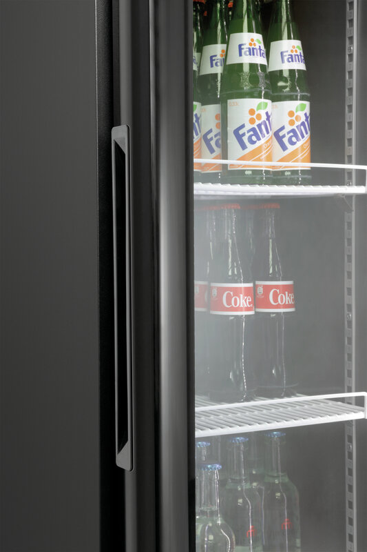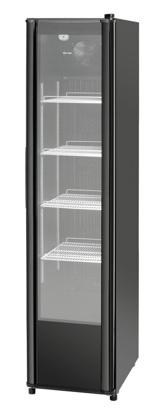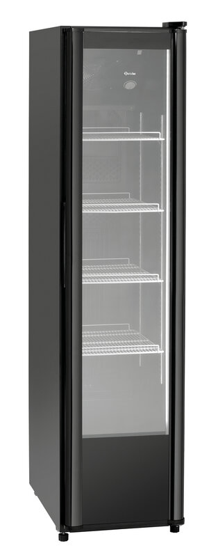 Zwart, smal, elegant - Een bijzonder dessign, dat meteen opvalt. Eten en drinken zien er direct aantrekkelijker en hoogwaardiger uit in deze koelkast met glazen deur en led-verlichting.