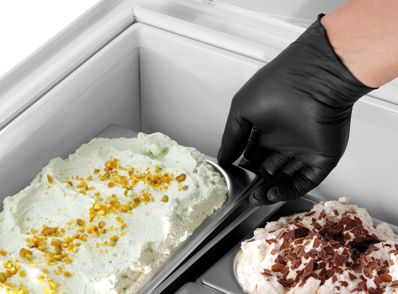Perfecte opbergruimte voor zelfgemaakt ijs - de ijsvitrine 3x5L-F is een uitstekende oplossing om desserts na de bereiding op aantrekkelijke wijze en koel te bewaren. Dankzij de diepliggende bakken wordt de ijsvorming aan het oppervlak tot een minimum beperkt.