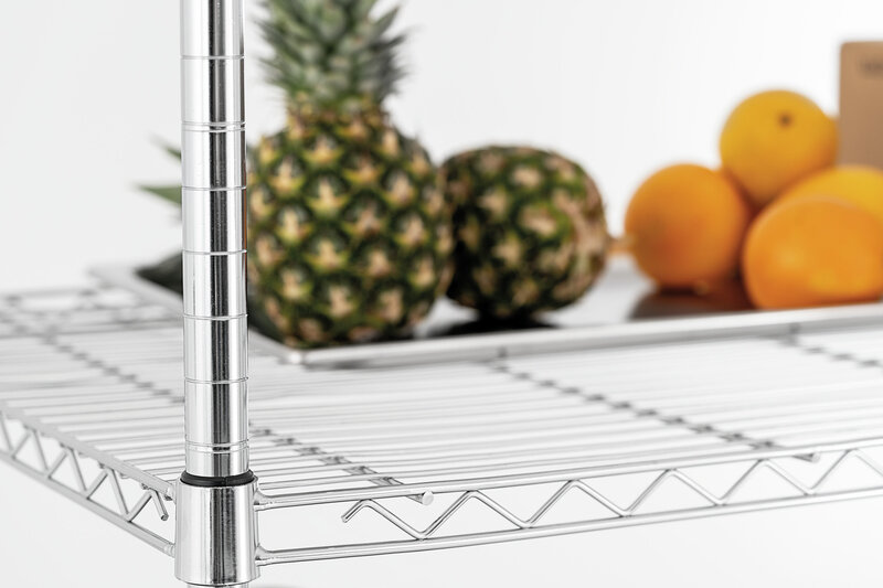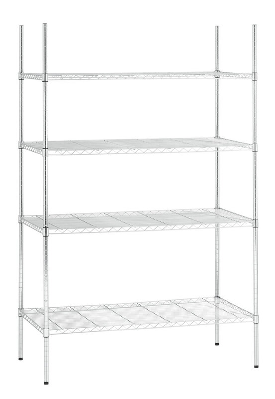Voorraadartikelen optimaal opbergen - deze mogelijkheid biedt het staande rek op 4 in hoogte verstelbare niveaus van verchroomd staal. Dankzij het eenvoudige insteeksysteem kan dit in een handomdraai worden gemonteerd en is direct klaar voor gebruik.