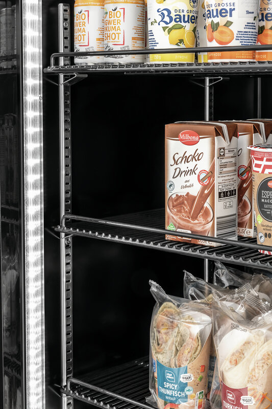 Combinatie van koelkast en vrieskast in compleet zwart design met een inhoud van 820 liter. De glazen deuren maken een direct zicht op het eten mogelijk, dat door de apart inschakelbare LED-verlichting in het juiste licht kan worden gezet.