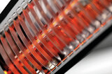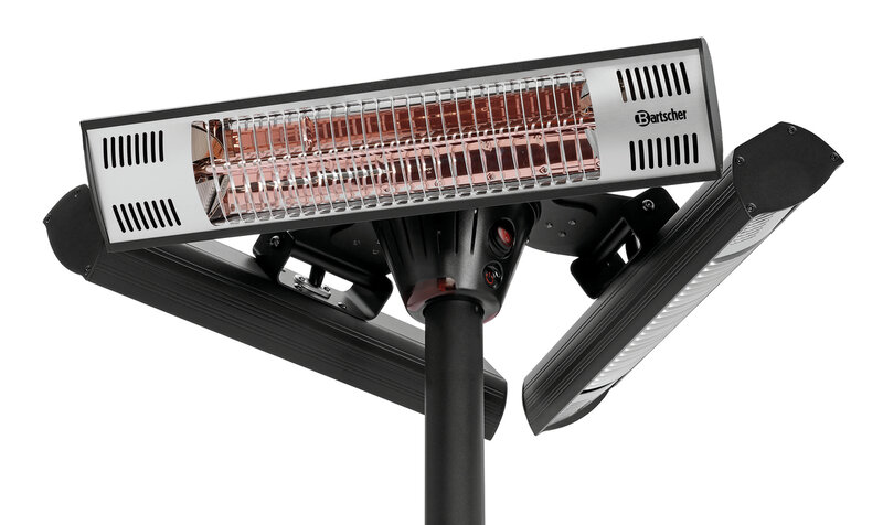 Terrasverwarmer met tot 360° warmtestraling rondom. De 3 kantelbare warmtestralers zorgen voor effectieve infraroodwarmte in de omgeving.