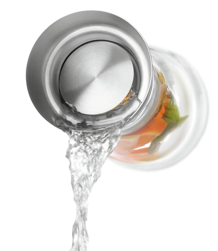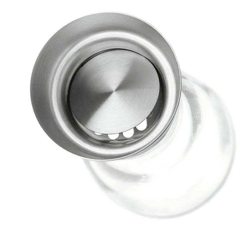 De glazen karaf met een inhoud van 750 ml overtuigt reeds bij de eerste blik door het elegante design. Bovendien biedt het deksel een schenktuit met een automatisch openende en sluitende klep van rvs. De geïntegreerde zeef maakt probleemloos uitschenken van dranken gecombineerd met ijs of vruchten mogelijk.
