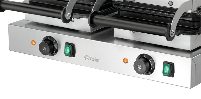 Het wafelijzer met 2 bakeenheden in Brusselse wafelvorm overtuigt niet alleen door het hoge warmtegeleidingsvermogen van de gietijzeren bakplaten, de robuuste uitvoering en de goede prestaties. De beide afzonderlijke Aan/Uit-schakelaars maken bovendien een ongecompliceerd en op de behoeften gebaseerd gebruik mogelijk.