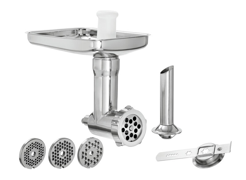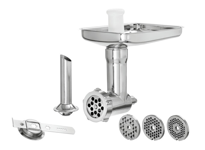 Absoluut veelzijdig voor de worstproductie en gebakvoorbereiding: met de geperforeerde schijven in 4 verschillende maten, de worstvulhoorn en de zandkoekvoorzet vormt dat de bij de keukenmachine KitchenAid passende gehaktmolen-set een compleet pakket.