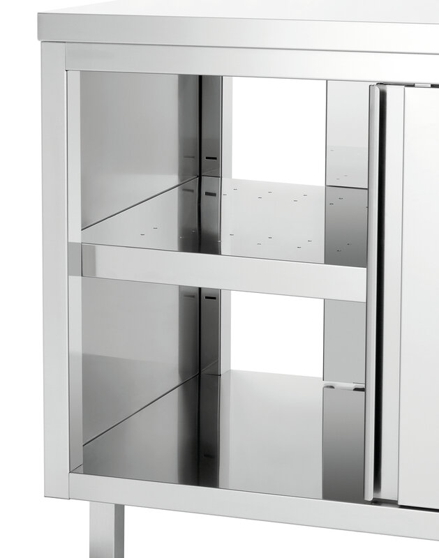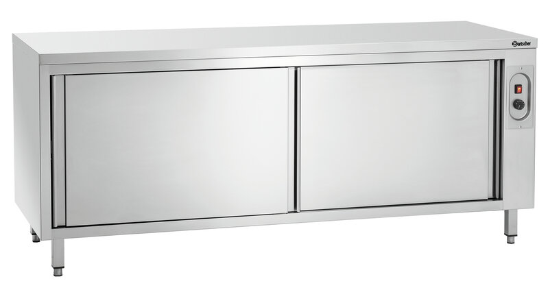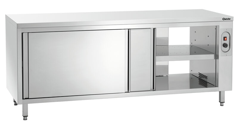 De warmkast met een breedte van 2 meter biedt een traploos instelbare, verwarmde opbergruimte met bediening aan beide kanten. Het robuuste oppervlak van roestvrij staal vormt tegelijkertijd een solide werkelement in de keuken.
