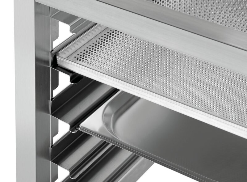 Gastronorm en bakkerijnorm - Het robuuste onderstel voor combi-steamers 1/1 GN van de serie Silversteam biedt ruimte voor 10 roosters en platen in 1/1 GN- of in 600x400-bakkerijnorm-formaat.
