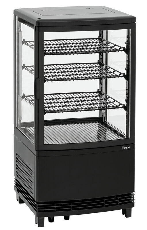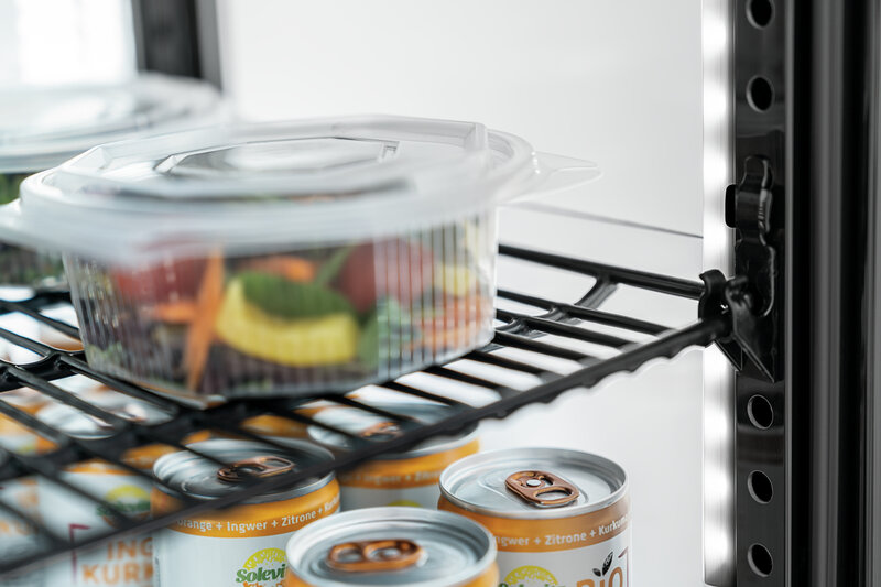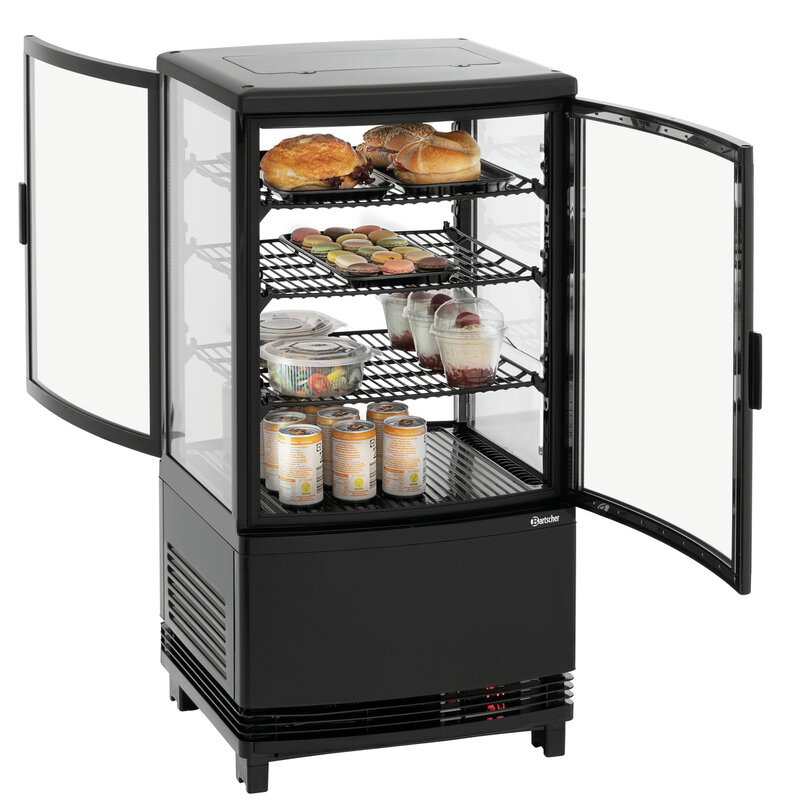 De compacte koelvitrine in zwarte uitvoering met een inhoud van 64 liter overtuigt met zijn twee glazen vleugeldeuren voor gemakkelijke bediening en het duurzame, krachtige ontwerp.