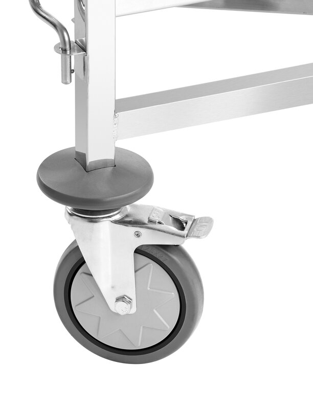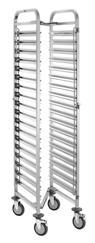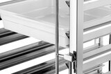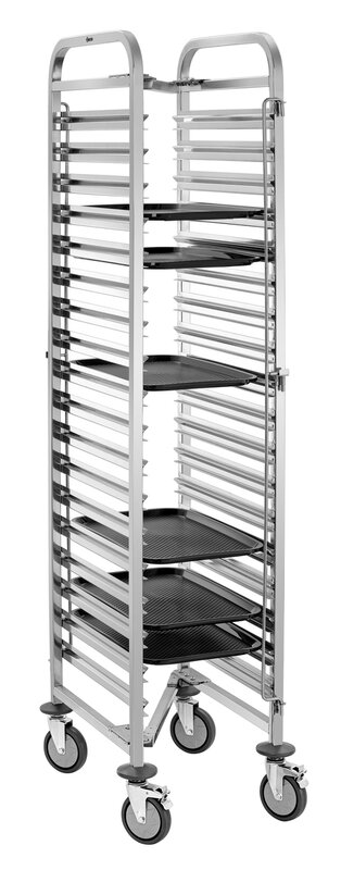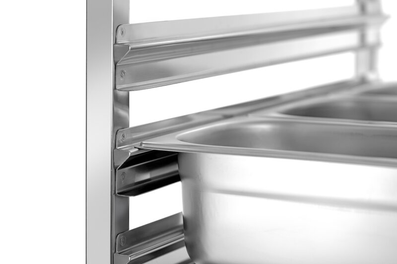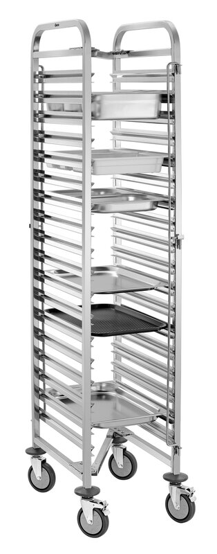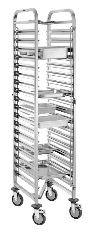 De schappenwagen met 18 legplanken in 1/1 Formaat biedt royale opbergruimte voor efficiënte dagelijkse keukenwerkzaamheden. De containersluiting aan beide zijden voorkomt op betrouwbare wijze dat de reservoirs wegglijden en zorgt voor een stevige grip tijdens het transport.