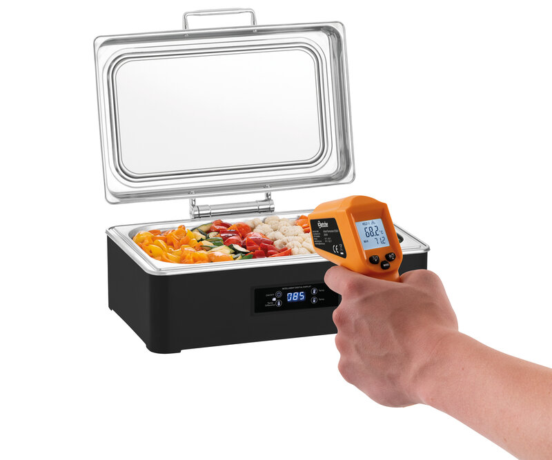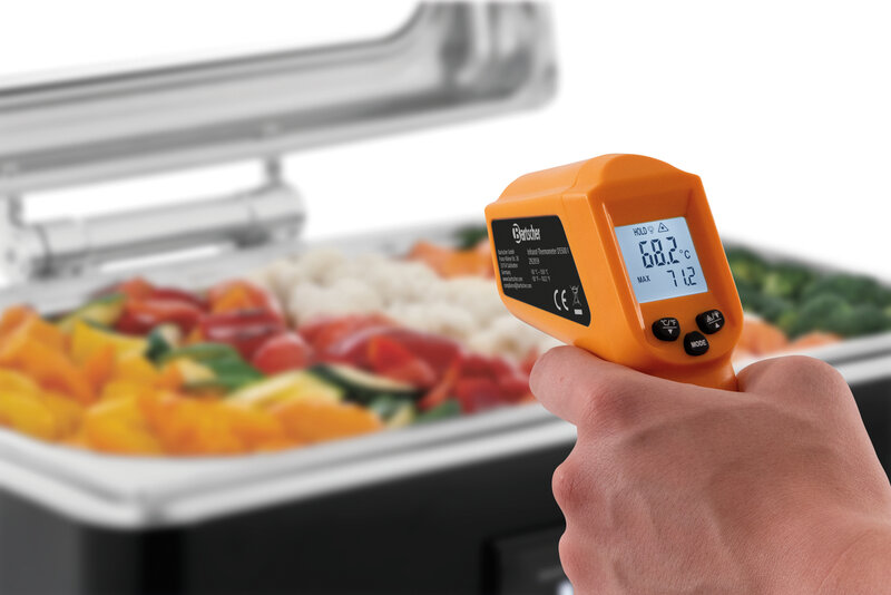 De infraroodthermometer met digitaal display en geïntegreerde laserpointer maakt het eenvoudig om oppervlaktetemperaturen te controleren. Het is bijzonder geschikt voor het controleren van de koudeketen voor verse en diepgevroren producten en voor gebruik bij het buffet of de toonbank.