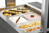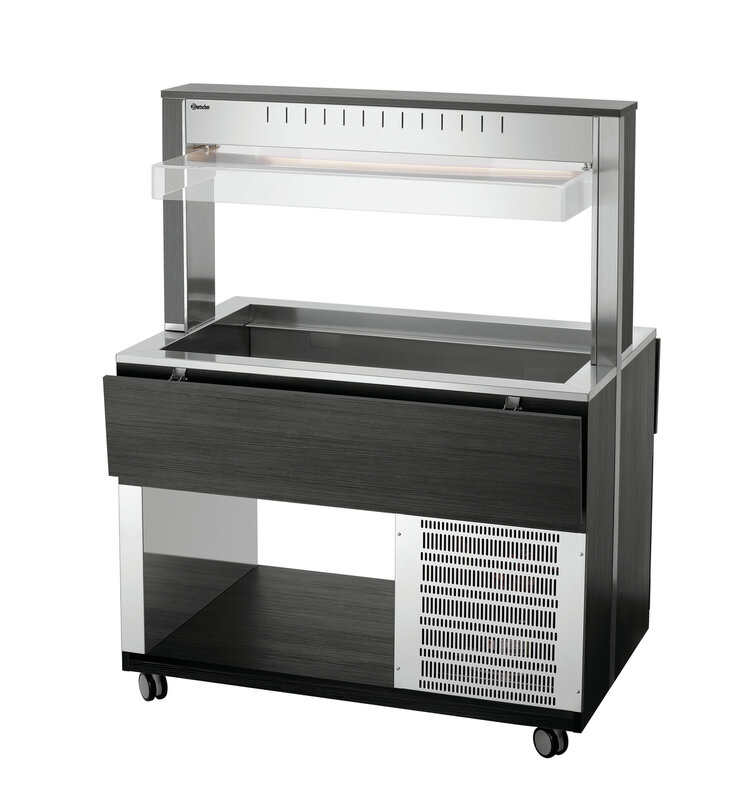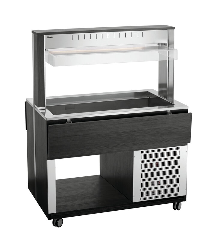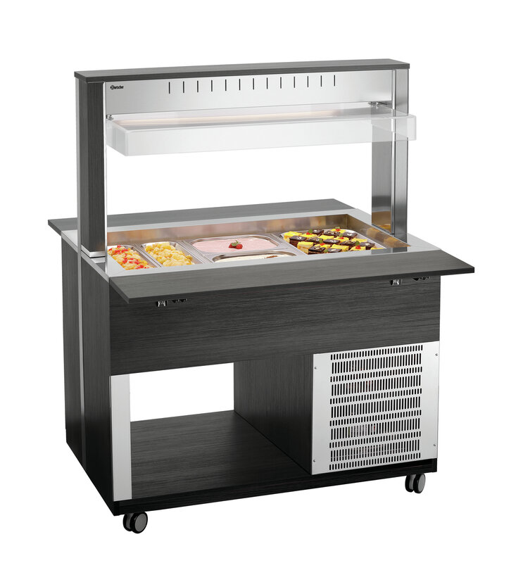 De mobiele buffetoplossing in een modern houtdesign - De buffetwagen met hoestbescherming en led-verlichting voor 3 GN-containers 1/1 GN en houdt gerechten betrouwbaar koud bij het buffet.