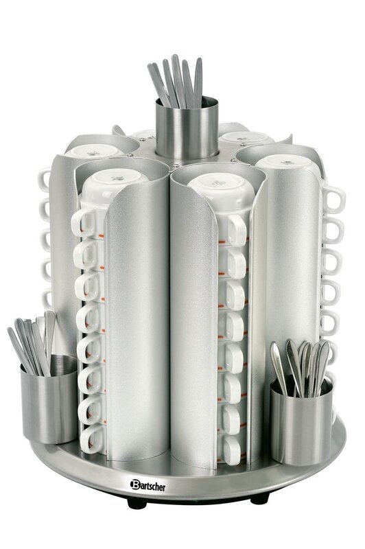 Koffiekopjes en -lepels direct bij de hand. In de kopjesverwarmer met praktische draaibare sokkel kunnen tot 48 koffiekopjes gelijktijdig worden voorverwarmd.
