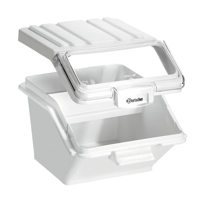 Robuuste, stapelbare voorraadcontainer voor een hygiënische bevoorrading van verschillende graansoorten en van specerijen, rijst of noedels. Het praktische transparante klapdeksel maakt een snel overzicht mogelijk van welke droge goederen zich in de container bevinden.