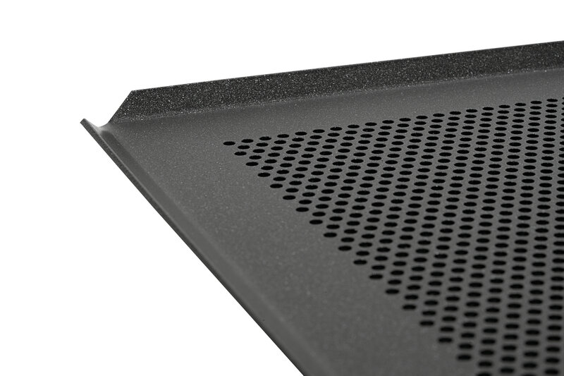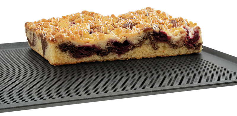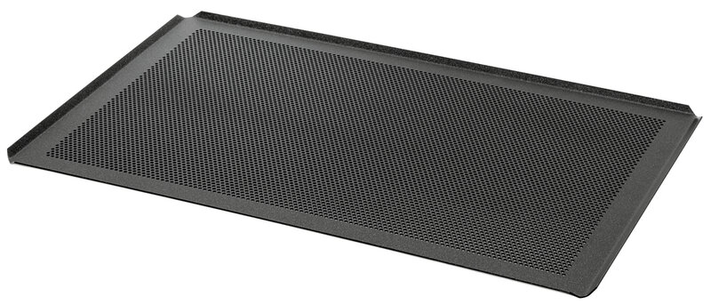 Geperforeerde plaat in Bakkersnorm 600x400 van aluminium. Dankzij de innovatieve en robuuste antiaanbaklaag wordt het vasthechten van de bakwaren voorkomen.