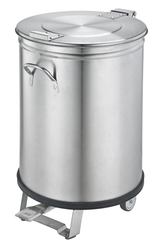 - RVS afvalbak op wieltjes met pedaal om deksel te openen