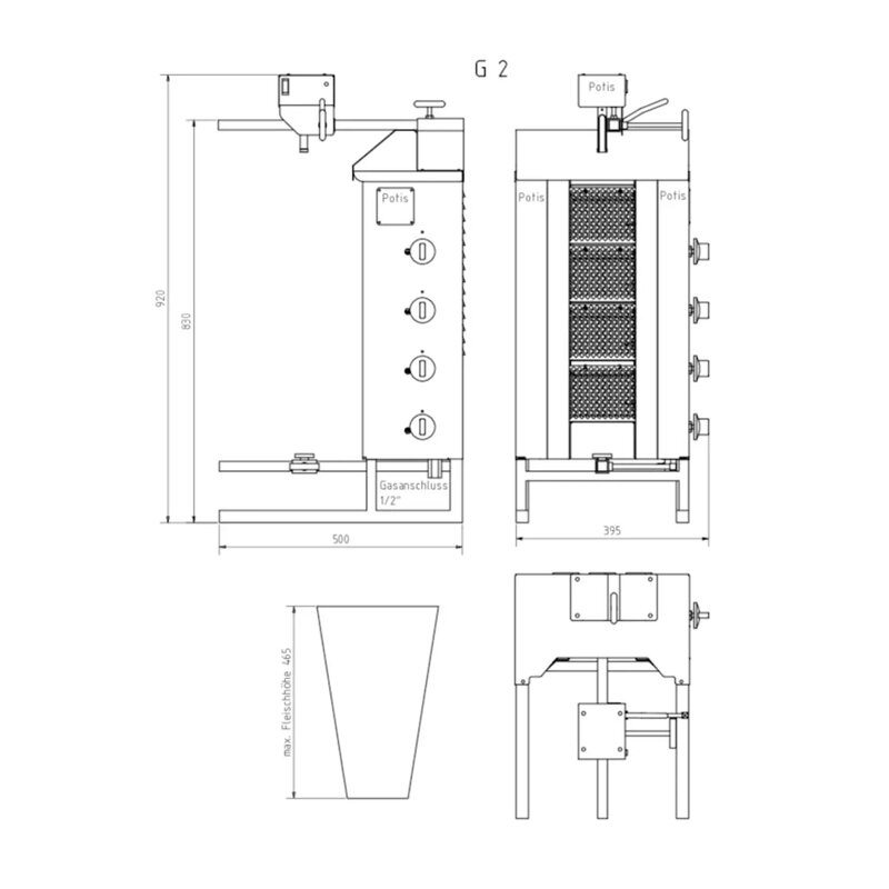 Dönergrill | Standard | Gas | 4 Branders | 7kw (4x 1.75kw) | Max. 30kg | Rotatiemotor Boven | 500x650x920(h)mm
