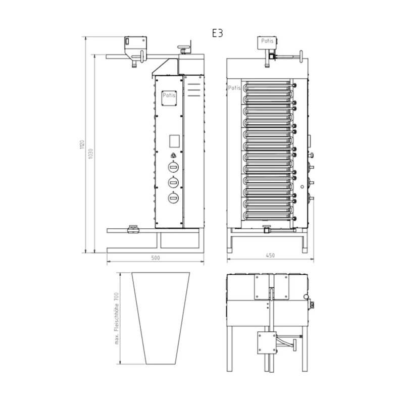 Dönergrill | Standard | Elektrisch | 6 Elementen (keramisch) | 7.8kw (400v) | Max. 50kg | Rotatiemotor Boven | 500x650x1120(h)mm