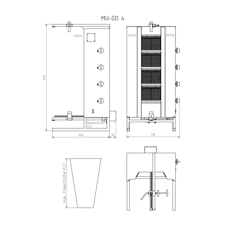 Dönergrill | Serie MU | Gas | 4 Branders | 11.2kw (4x 2.8kw) | Max. 70kg | Rotatiemotor Onder (achter) | 550x780x1030(h)mm