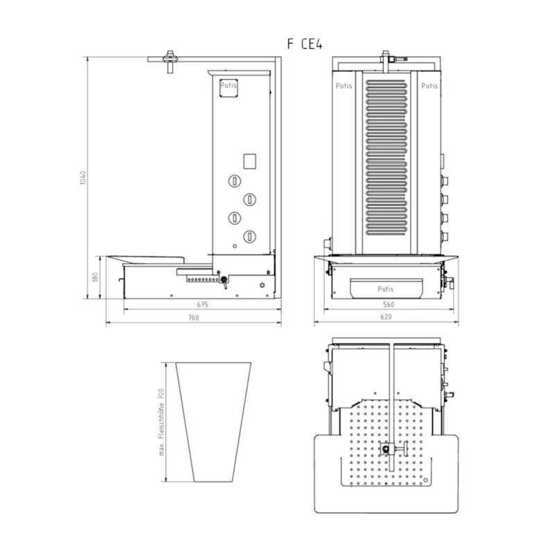 Dönergrill | Serie F | Elektrisch | 4 Elementen (glaskeramisch) | 7.6kw (400v) | Max. 70kg | Rotatiemotor Onder | 620x760x1040(h)mm