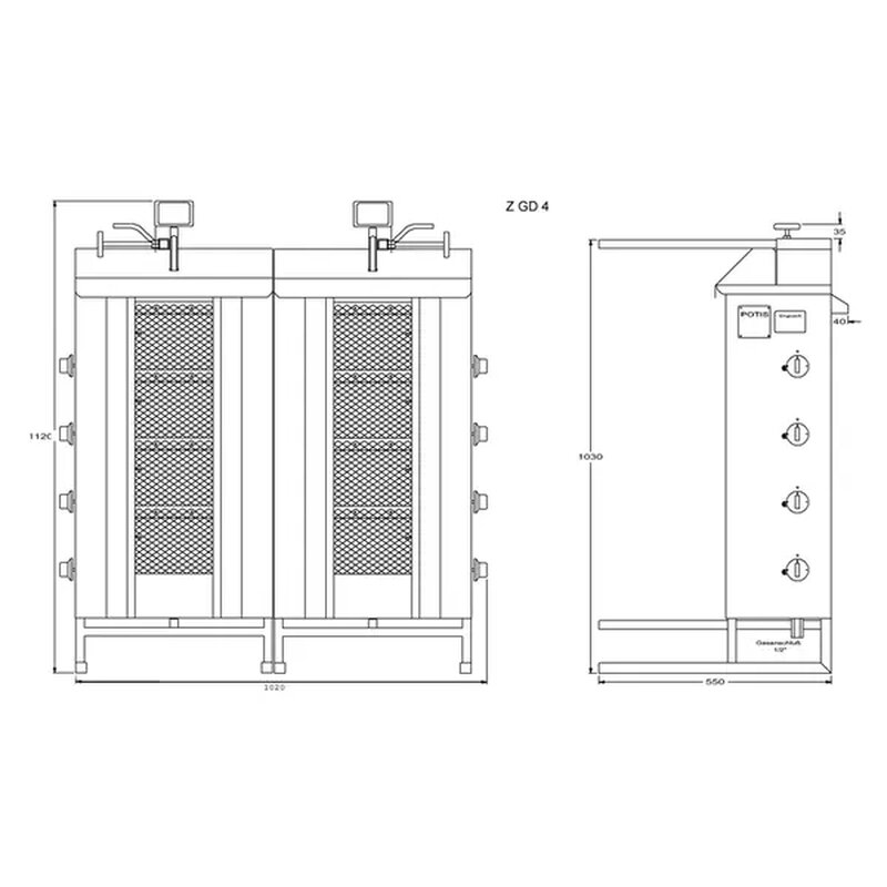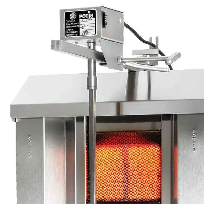 Dönergrill | Standard | Gas | 2x 4 Branders | 28kw (8x 3.5kw) | Max. 2x 70kg | Rotatiemotoren Boven | 1100x750x1120(h)mm