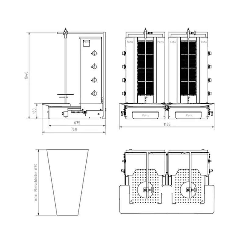 Dönergrill | Serie F | Gas | 2x 4 Branders | 22.4kw (8x 2.8kw) | Max. 2x 70kg | Rotatiemotoren Onder | 1140x760x1040(h)mm