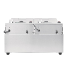 Tafelmodel friteuse met RVS deksels. Gescheiden tanks voorkomen kruisbesmetting en zijn afzonderlijk bedienbaar wat energie bespaart op minder drukke momenten.