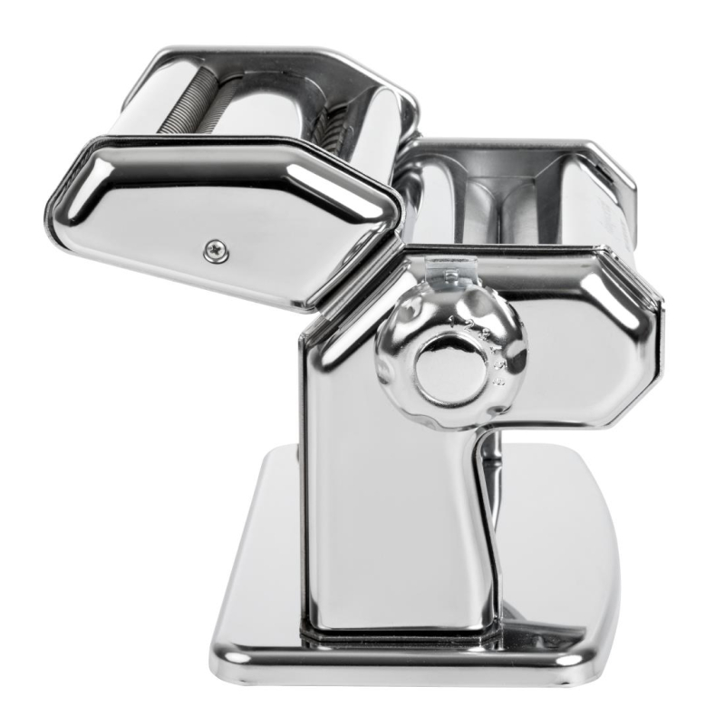 Verchroomde pastamachine voor het maken van 15cm brede pastavellen in 6 verschillende diktes. Geleverd met 'duplex' te koppelen snijder, om tagliatelle en fettuccine te maken. Optionele lade voor ravioli en roller verkrijgbaar.