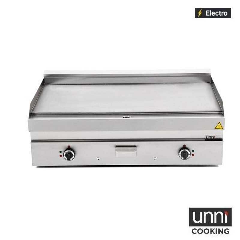 De UNNI-COOKING 650 SERIES Elektrische Bak-/Grillplaat is ontworpen voor professioneel gebruik in de horeca. Deze duurzame roosterplaat van roestvrij staal beschikt over een glad oppervlak, ideaal voor het bereiden van gerechten zoals kipspiesen en andere grillspecialiteiten. Dankzij de EGO-thermostaat kunt u de temperatuur nauwkeurig instellen tussen 100 en 300°C, wat zorgt voor een perfecte garing. De staafbrander garandeert een gelijkmatige warmteverdeling over het gehele oppervlak, zodat er geen warme of koude plekken ontstaan tijdens het bakken of grillen. Het onderhoud van deze elektrische bakplaat is eenvoudig dankzij de aanwezige afvoergoot en afvoeropening, waardoor overtollig vet en vloeistoffen moeiteloos kunnen worden afgevoerd. Bovendien is de plaat voorzien van een veiligheidsthermostaat voor een betrouwbare en veilige werking. Met zijn robuuste constructie en professionele prestaties is deze grillplaat een betrouwbare keuze voor elke keuken waar consistentie en efficiëntie essentieel zijn.