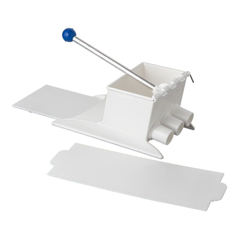 voor de produktie van aardappelkroketten (warm verwerken) of andere kroketten (gekoeld verwerken) in grote hoeveelheden, door de hefboom naar beneden te bewegen komen gelijke rollen uit de cylindervormige uitgangen, de rollen brengen de transportplank in beweging tot dat deze geheel gevuld is waarna zij op lengte gesneden kunnen worden, heeft 3 uitloopgaten, is vervaardigd uit kunststof met aluminium hefboom