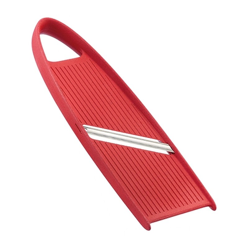 met een tweezijdig, zeer scherp mes, ideaal voor dunne plakjes komkommer, courgette, aubergine en ui, met een fijne rasp voor kaas, kruiden of fruit