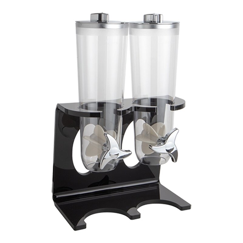 zwarte standaard met twee transparante vultrechters, geschikt voor muesli, cornflakes, noten etc.