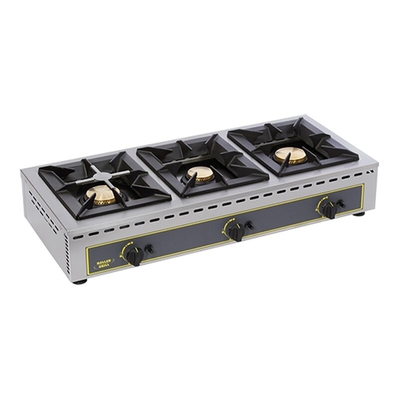 roestvrijstalen behuizing en gietijzeren panroosters, voorzien van thermokoppel, piëzo elektrische ontsteking, koperen branders en roestvrijstalen morspannen, geleverd inclusief aardgas sproeiers