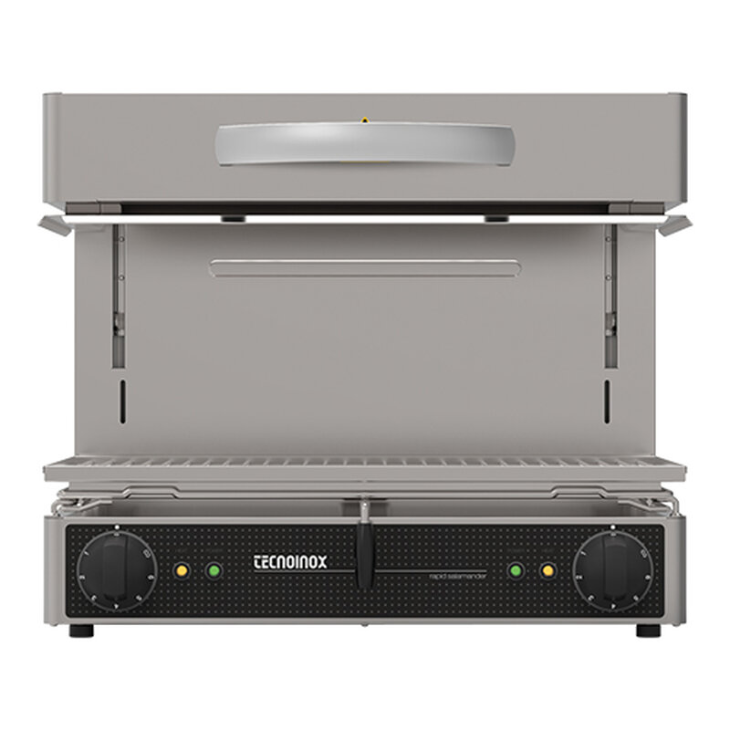 door het lichtlopende bovenstuk is de grillhoogte variabel instelbaar, de naar omlaag gereflecteerde hittestraling zorgt voor een unieke grillwerking, met lekbak, uittrekbaar verchroomd rooster en twee onafhankelijk instelbare temperatuurschakelaars