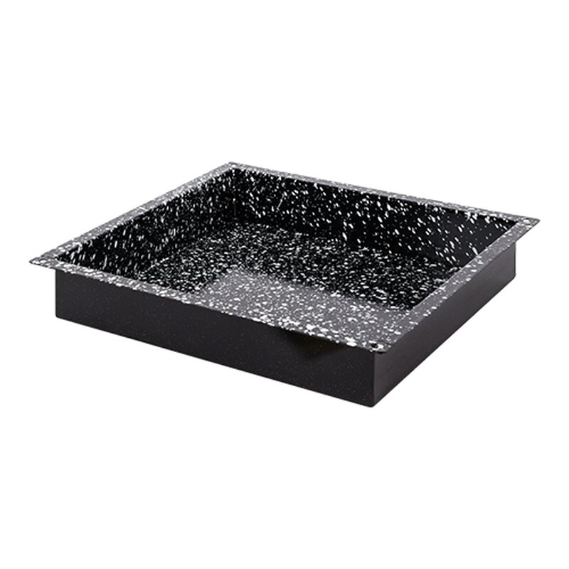 om het reinigen van de ovenschaal te vergemakkelijken, zijn speciale witte spikkels met een diameter tussen 1 en 4 mm op het oppervlak aangebracht. Door dit speciale procédé blijft het vuil discontinu plakken, waardoor het schoonmaken een stuk eenvoudiger wordt