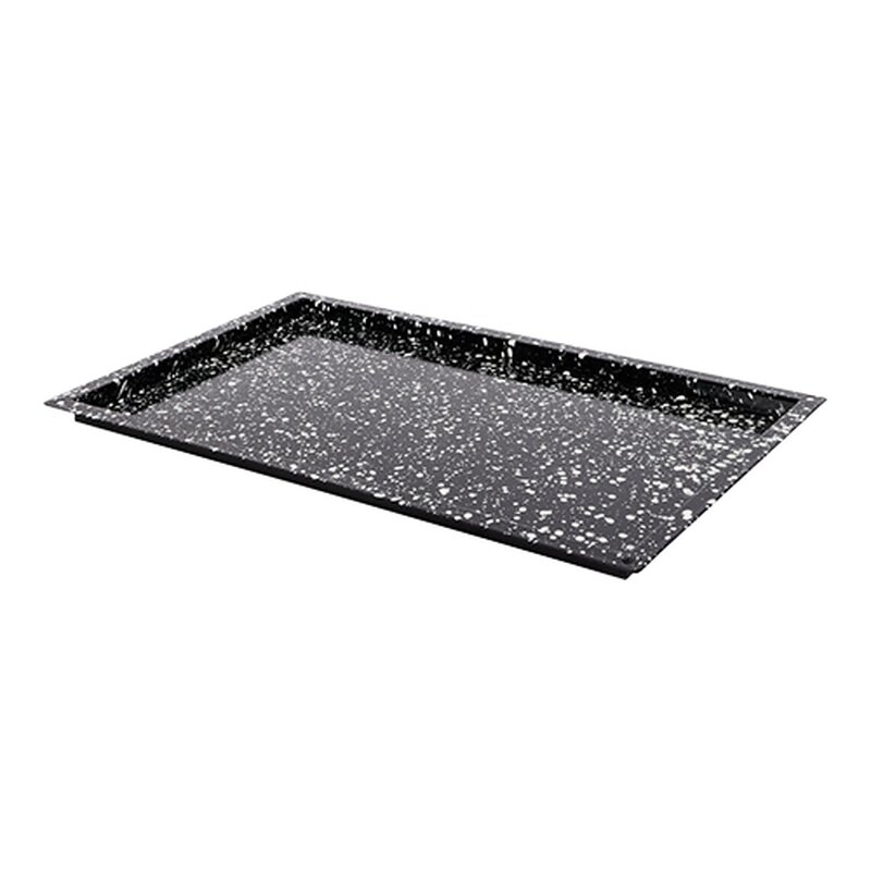 om het reinigen van de ovenschaal te vergemakkelijken, zijn speciale witte spikkels met een diameter tussen 1 en 4 mm op het oppervlak aangebracht. Door dit speciale procédé blijft het vuil discontinu plakken, waardoor het schoonmaken een stuk eenvoudiger wordt