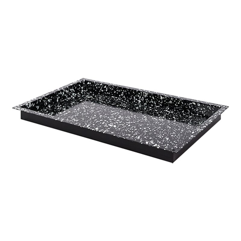 om het reinigen van de ovenschaal te vergemakkelijken, zijn speciale witte spikkels met een diameter tussen 1 en 4 mm op het oppervlak aangebracht. Door dit speciale procédé blijft het vuil discontinu plakken, waardoor het schoonmaken een stuk eenvoudiger wordt