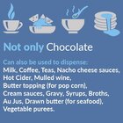 verhitting geschiedt volgens het bain marie principe waardoor aankoeken van de chocolademelk wordt voorkomen, de dispenser is uitgerust met een transparante container, aftapkraan, roermechanisme en een lekbakje, ook geschikt voor dikkere dranken