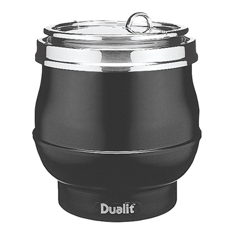 de buitenwand van de soepketel is van corrosie bestendig aluminium, uitgevoerd met roestvrijstalen binnenpot, deksel en opvangrand voor gemorste druppels, de soepketel is traploos instelbaar, met 'override' thermostaat alsmede automatische beveiliging om oververhitting van elementen en bedrading te voorkomen. De soepketel is zowel met water als droog te gebruiken