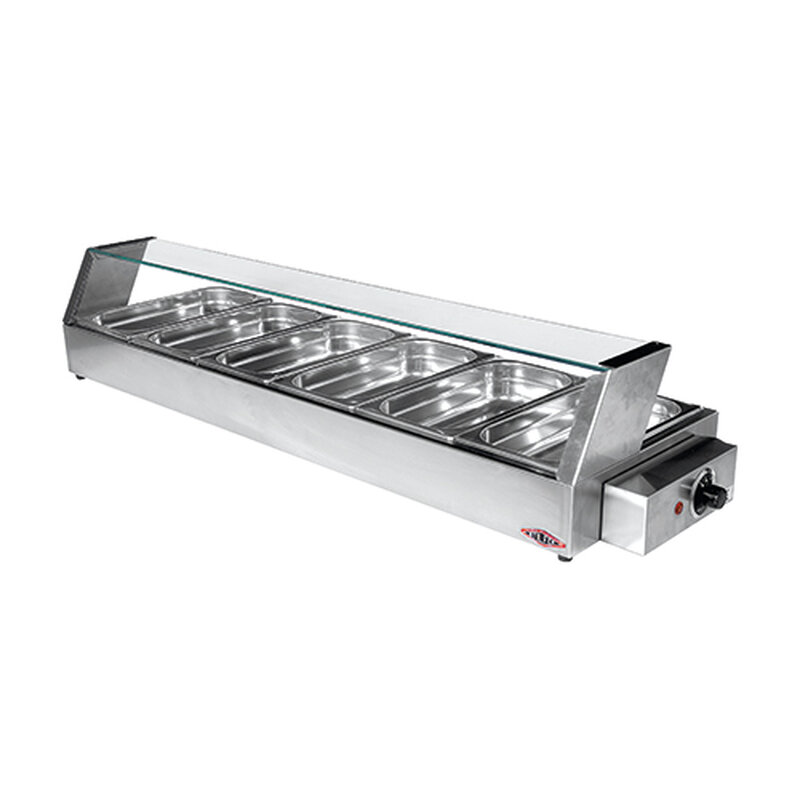 bain marie warmhoudvitrine uitgevoerd in roestvrijstaal met veiligheidsglas en thermostatisch instelbaar, geschikt voor 1/3GN bakken van max. 40mm diep, wordt zonder GN bakken geleverd