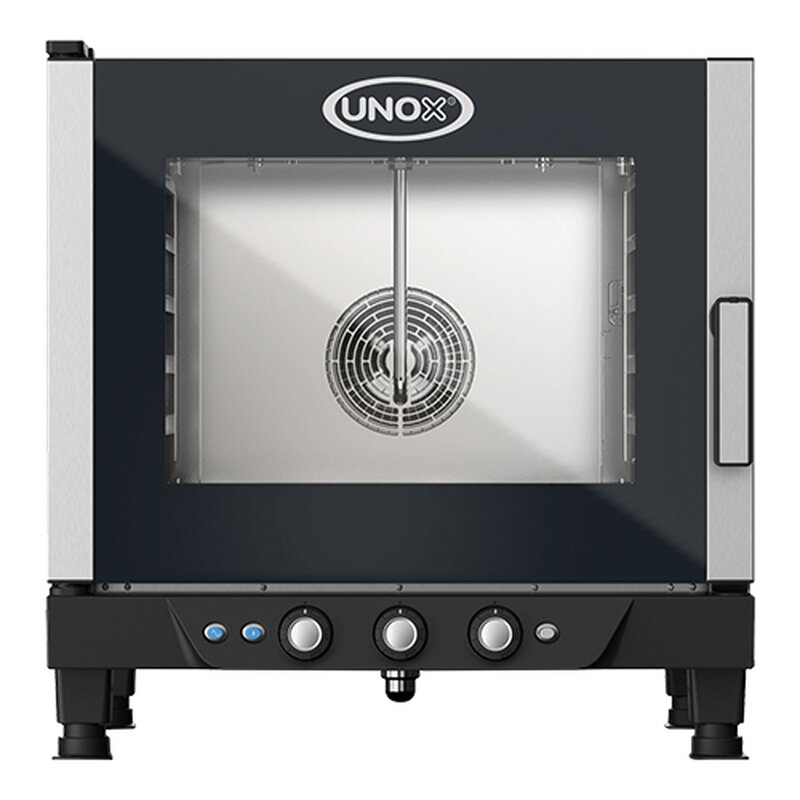 de UNOX Cheflux Manual beschikt over draaiknoppen op het controlepaneel met de mogelijkheid om tijd, temperatuur en de hoeveelheid vocht in te stellen en de keuze voor 2 ventilatie snelheden. De oven beschikt over Steam.Plus technologie voor het toevoegen van vocht aan het bakproces vanaf 48°C in stappen van 20%, Air.Plus voor een perfecte heteluchtcirculatie en de Dry.Plus technologie zorgt voor afvoer van vocht uit de ovenruimte en het drogen van producten voor een optimaal bakresultaat