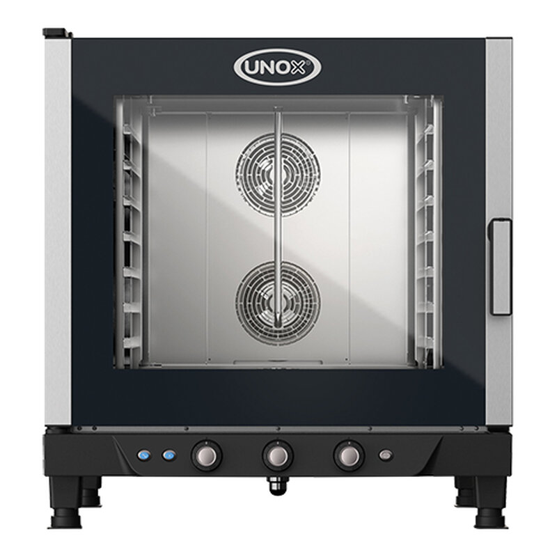 de UNOX Cheflux Manual beschikt over draaiknoppen op het controlepaneel met de mogelijkheid om tijd, temperatuur en de hoeveelheid vocht in te stellen en de keuze voor 2 ventilatie snelheden. De oven beschikt over Steam.Plus technologie voor het toevoegen van vocht aan het bakproces vanaf 48°C in stappen van 20%, Air.Plus voor een perfecte heteluchtcirculatie en de Dry.Plus technologie zorgt voor afvoer van vocht uit de ovenruimte en het drogen van producten voor een optimaal bakresultaat