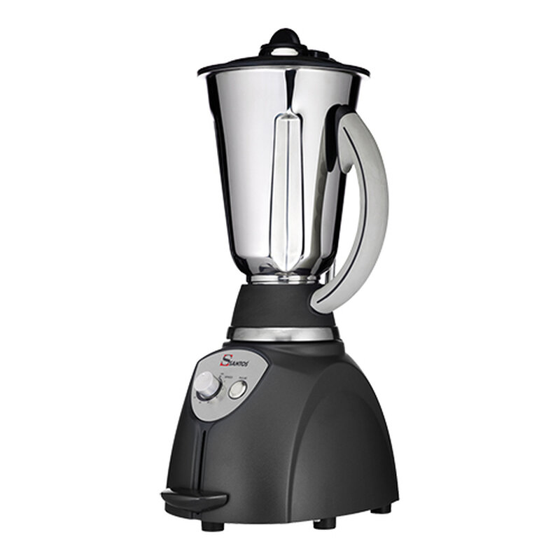 voorzien van een gepatenteerd veiligheidssysteem, d.w.z. dat door het inschakelen de beker en deksel geblokkeerd worden, de Santosafe is berekend op langdurig en intensief gebruik, voorzien van roestvrijstalen messtel en deksel met vulopening en rubber afsluitdop, traploos instelbaar d.m.v. toerental-regelaar, 1pk motor, de beker is omwisselbaar en te gebruiken op hetzelfde motorblok, de extra bekers zijn compleet met rubber afsluitdop en messtel